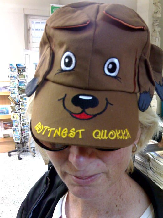 It was comforting to see the usual crap souvenirs: stubby holders, T-shirts in lurid primary colours, various unspeakable fridge magnets (the thong fridge magnets have been slashed to 50c each), wall plaques with built-in thermometers…but I gasped in horror when I saw this new abomination. The Rottnest Brown Quokka Hat looks nothing like a quokka. What’s with the huge red tongue, blue paws and striped tail? It’s as though a drunken Kiwi importer showed a blurry photo of a Tasmanian Tiger to a Chinese manufacturer…and the result was the Rottnest Brown Quokka Hat. $15.99 to be laughed out of the Quokka Arms