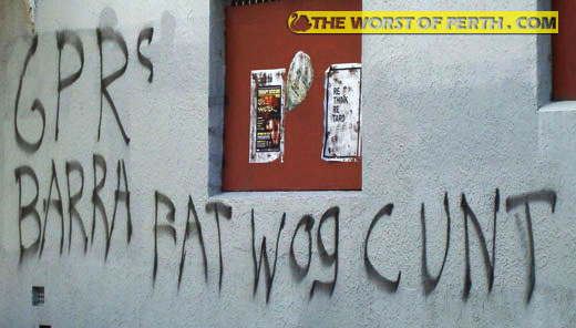 Nah, it’s not a slur. ‘Fat wog cunt’ is the name of the bloke who sprayed the message of support for Barra – that would rule out teh Cohen boy, besides, he’s too busy chasing down stories in the wild western suburbs.