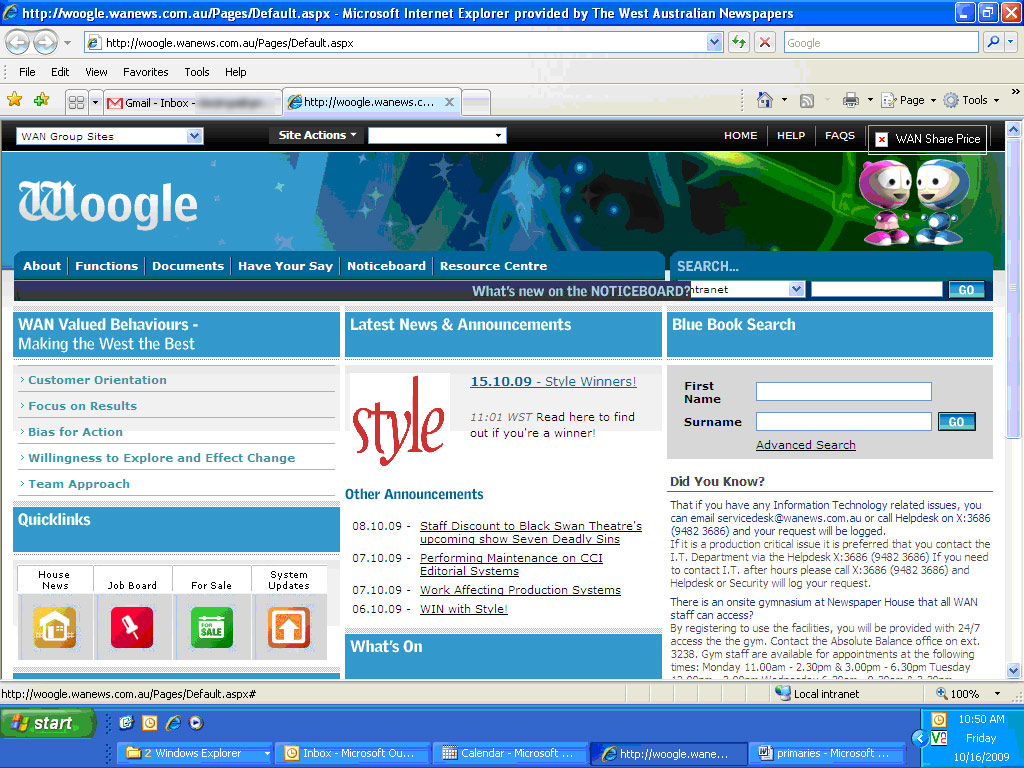 The Woogle interface just seems very sad. Staff members shuffling off to discounted Black Swan performances, hoping against hope that they’re “Style” winners, whatever that is, remembering to be customer oriented and have a “bias for action”. Sad.