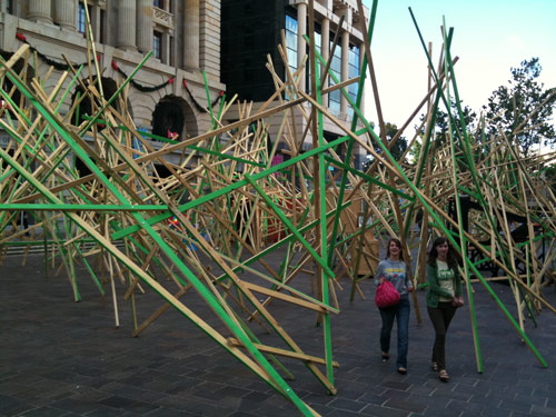 Lukewarm reaction to Bumpkin Highway sculpture yesterday, but how about this one in Forrest Place? This one is actually pretty crap. Inside the sticks though there was a machine you could blow giant smoke rings with. More interesting. Thanks to several people who suggested I get this one.