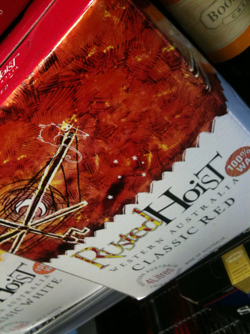 Have been so many good submissions lately, I thought I had better contribute something of my own. I dunno, a rusted washing line just doesn’t seem the appropriate motif to me. Maybe I’m wrong. The wine naming and labelling bizzo does seem to attract an odd crew. 1 2 3 4 5 6 You may need to slap on 4 litres of Lynx before tackling this box. Frank C, got any outre names in the relatives brews? Red Ring Reamer? They export to Taiwan I see.