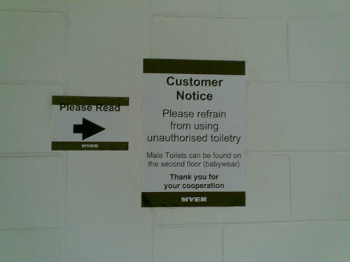 Surely this is just the thin end of the wedge for an infinite regression of “please read” signs? And what is unauthorised toiletry? Does that mean Blue Stratos? From Brer Bento.