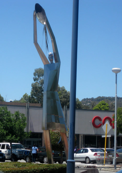 Vegan can’t seem to take anything from this Gosnells shopping centre sculpture other than it represents a burnt spoon. As a tribute to hash and heroin roasters of the Gosnells area it works well. Wait is it a burnt sperm? Somewhat insane, but has a certain compelling effect. Why it is in the Coles carpark is another matter. Didn’t stop to check if you could see up the dress Vegan? No matter. Excellent worsting anyway.
