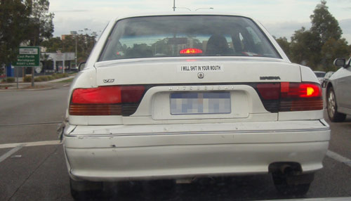 G-Banger saw this lovely sticker on Thomas Street in West Perth. G-Banger wonders if this person shared a house with I shit on Fat Chiks, would they ever have to clean the toilet? Is the person aggressive because they have to drive a fucking Magna?