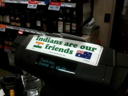 This one is from Melbourne, but I thought you might like to see how sophisticated Melbourne piss shops are combating Indian student bashing. In Perth we are more likely to have Fuck off we’re full Indian friends. Thanks Meccano.