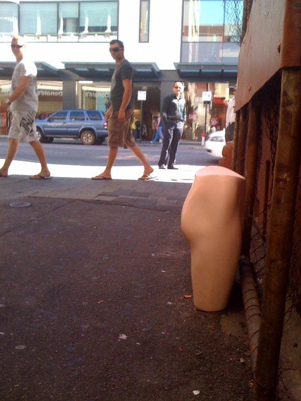 When Thomo emailed that he had shots of a bum in an alley I was hesitant. Should some poor devil down on his luck be a part of the freakshow? After all, it would probably have turned out to be Paracleet, WAtching, Outrage or Bento, maggoted after a bender or council meeting. The actual photos were however even more outre than a shot of an unconscious Cookster lying drunk in a pool of his own filth would have been – in an arty kind of way. The two dudes with the thongs are a nice touch too. Obviously thinking, “There butt for the grace of God…”One looks like Daniel Kerr, but I don’t think he can walk at the moment. William Street.