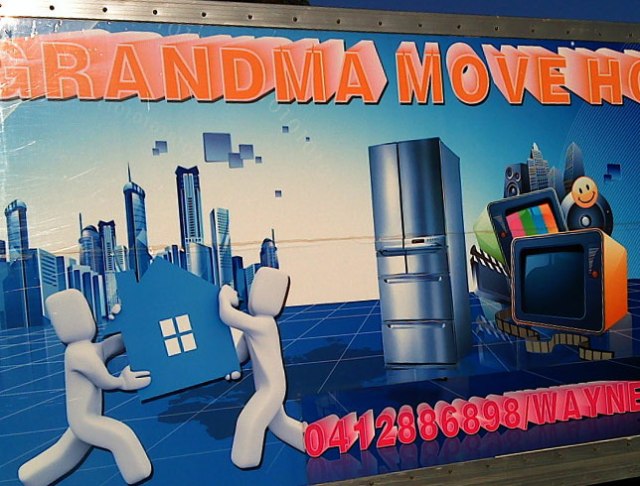 I think you’ve all got it wrong. This truck is a masterpiece -it just goes on giving in a way that only great art can. There is so much here I can’t stop looking at it. “Grandma move House” is that a comment or an order? And why does grandma have to move house? It’s pitiful that at her age she has to suffer the indignity of having her worldly goods placed out on tiles that are deliberately highly polished with the intent to cause her to fall and break a hip. As if this wasn’t enough – I can’t believe that no one else has commented on the series of rectangular alien craft zoning in from the East. Are they coming for granny or for Wayne? The use of perspective, light, colour what can I say? The artist has taken a quantum leap from the established safety of text book design and has created a work reminiscent of Don van Vliet, Boulet or Yamashta.