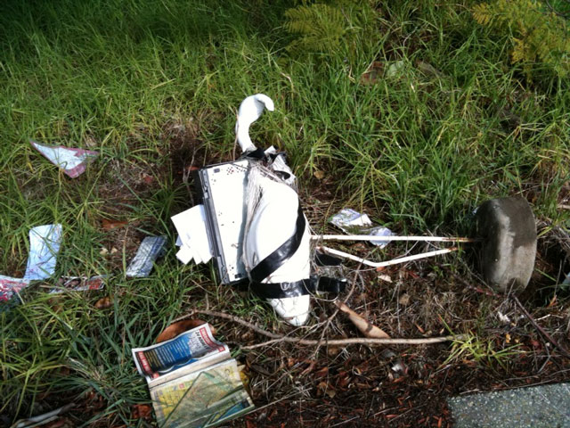 It may be my brain or the fact that the number of posts is now over 1200, but I was certain that I had posted this magnificent Lathlain letterbox consisting of a vcr lashed to a concrete flamingo. And yet I can’t find it. I know it has been sent to me. How could I have neglected such a superb mound of crap?It’s even got the number 5 on it! JaneZ sent the latest pics, including its recent descent into vanished worst status. This is the exact same concrete flamingo that I need to complete my own set, but I fear this one will never grace a bed of agapanthas again. At least Dominos keep stuffing the vcr slot.