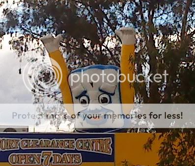 Why don’t The Ferralls use this hideous mascot more often instead of their even more hideous bonces? I tried to get a shot of one on Leach Hwy, but it “blew off” before I could get to it. Thanks to WAtching for this one in Leederville. Looks more like a slice of mouldy toast than a mattress.