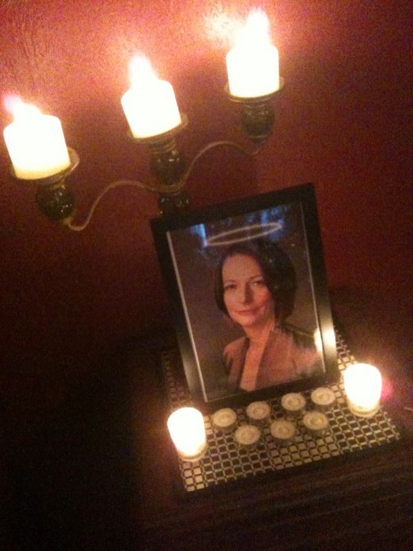 That little voodoo-catholic shrine for Gillard’s soul now wandering lost in political purgatory certainly sends a shiver up my spine. Most people know it’s inadvisable to get out of the car at nights on that lonely side of town. That strange cooking smell you get sometimes driving along guildford road? That’s frying placenta. Wind the window up, don’t stop for anyone. Or thing.