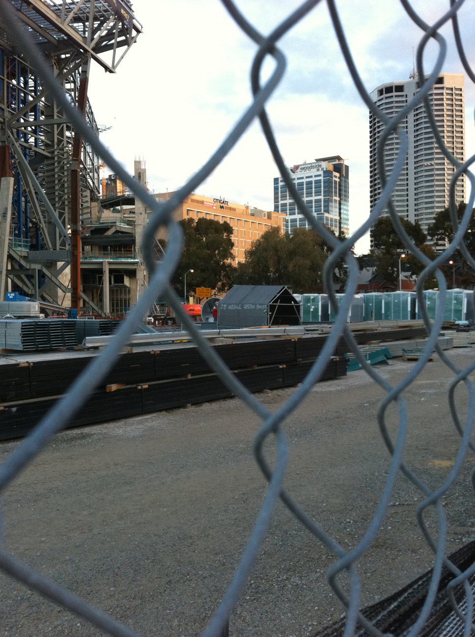 I’ve walked past the Perth Arena site a few times without taking a shot, believing that not much worsting would be available until the terrible design was realised, (apart from the massive budgetary cock-ups by the previous Labor Government and the fact that an event as lame as the Hopman Cup was considered a worthy trigger for wasting tax money on an eyesore,) so it was nice that Tristan H was able to get this.