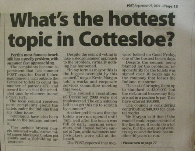 The Worst of Perth officially starts its 4th year of production! That’s 48 000 coments, 1300 posts and 2800 uploade original images. Let’s celebrate with a story of TWOP stalwart Outrage Cohen hanging atround outside a public toilet. And we must discuss a drinking celebration to. Small bar anyone?