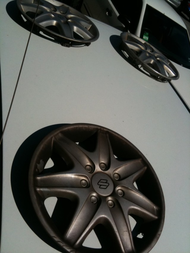 This could have been perpetrated by the owner of the car. The three hubcaps clearly represent the Trinity, just as the handwritten note is possibly a beseechment of the Lord, rather than being addressed to the owner.