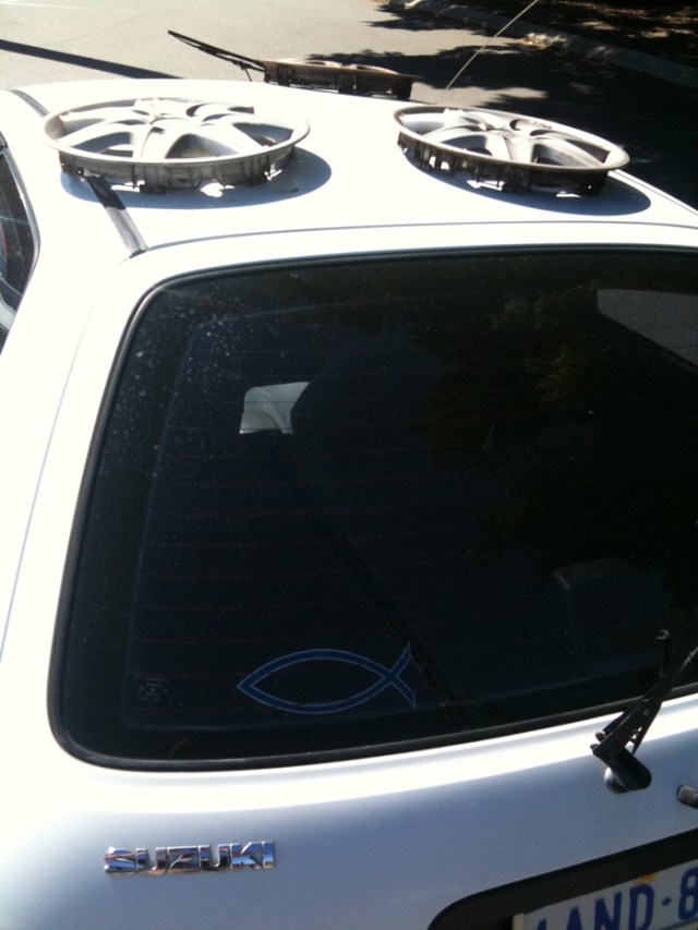 Parking rage at Curtin Uni. Funny thing is, the poor christian’s Suzi wasn’t sooo badly parked. The fish sticker will add a lot of rage to a situation though – and ruin grammar. Wanted to add a sign saying Where’s my apostrophe?