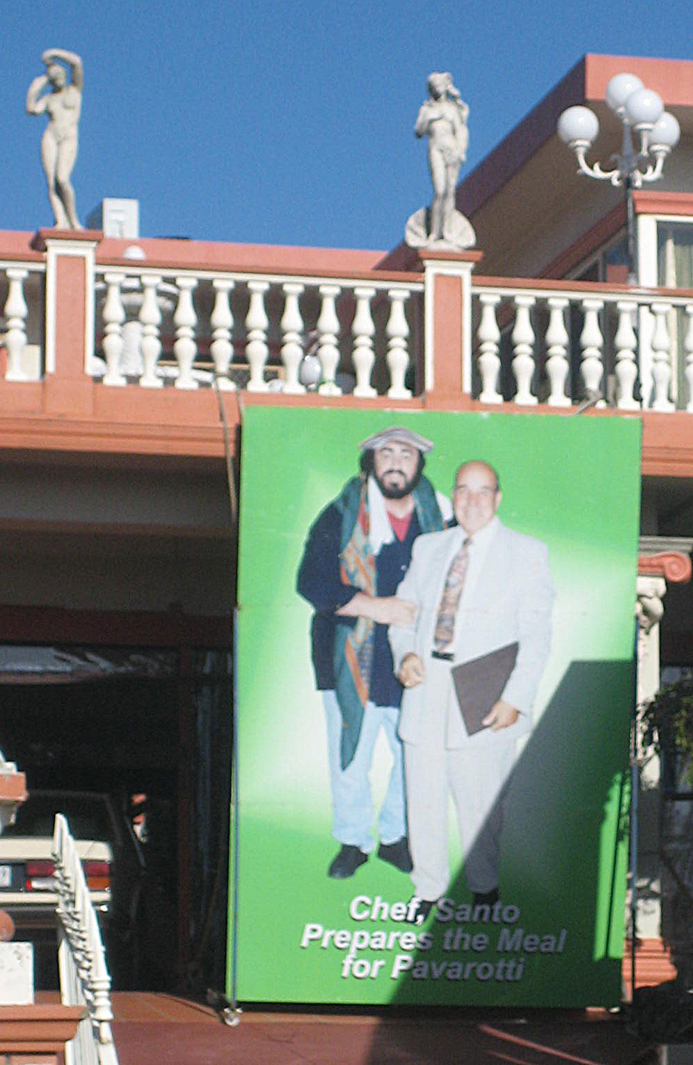 I note that Pavarotti is grabbing on to Santo’s arm for dear life. Perhaps he’s excited by the idea Santo will cook for him, and is hanging on in case he changes his mind.
