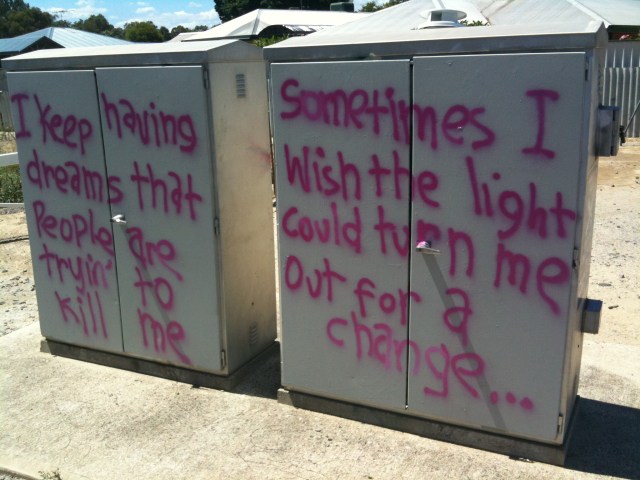Okaaaay then. Here’s one I would be happy for the police to prosecute. This belongs in a diary with a ribbon, not on our defenceless electrical boxes. And I believe this slop is also plagiarised. Dude, you’re outsourcing your suicide fantasies? And it’s pink. Twice in a row for Swan view. Maybe they are all too fat? By Samir.