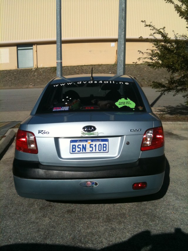 You’re right about the ubiquitiousness. Looking around for a new (used) car purchase, Team RubyRuby went for some test drives on Saturday. Asked about the roo bar out front of one of the vehicles, newly arrived in Perth Pommy salesman winks at Mr RR and comments on its usefulness to “run the blacks down”. Until now I was simply bemused – WTF?! – but maybe the ubiquitous nature of FOWF stickers goes some way to explaining this? (Mr RR thinks it may also be his skinhead look that he’s rocking at the moment, but I’m not sold on this explanation. Or the car…)