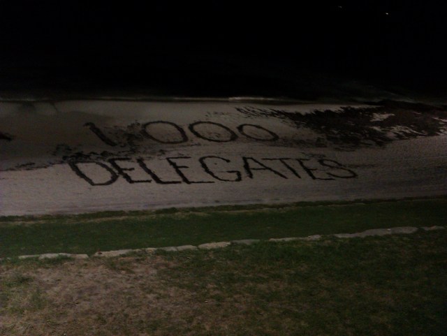 This gives me the fear. Cottesloe beach last Friday night, and it’s made from…seaweed? The prophylactics of drunks rooting on the sand? Or, were the makers despairing at being stuck in Dullsville and dearly hoping an Emirates jet would spot their plea and send help? Pete F. sent this. He wonders if it was some kind of SpongeBob CHOGM thing, or the aftermath of a dugong conference. Too many questions.
