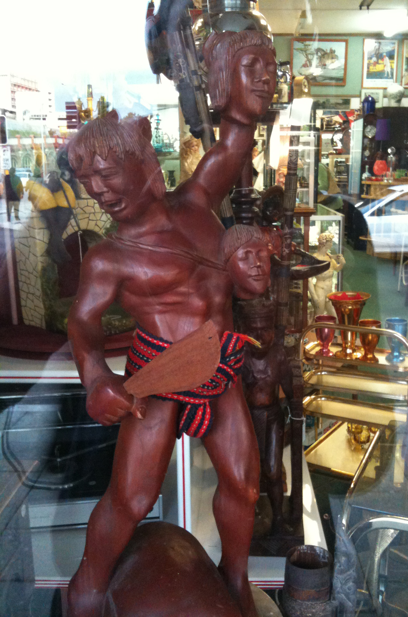 Two worst worthy items in curio shop William Street (Turnstyles) . A carving celebrating decapitation, and a whole roll of Boans wrapping paper. I was going to ask the price, but the shop person was absorbed in playing solitaire on the counter. The Boans paper would see you through a decade of worst Christmases and Birthdays. Old buffers will love it, especially those that called it Bo-ans.