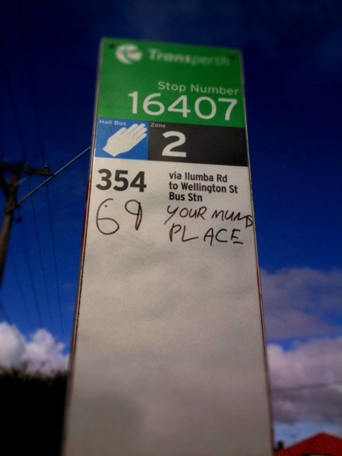 There was indeed a Route 69 service, which has only been cancelled in recent times, which was similar to the 67 and 68 to Mirrabooka via Teh Arrondissement and Grand Prom; the 67 is the most direct and the most frequent, the 68 trundles along deep into Old Dianella (near the A href=”https://theworstofperth.com/2007/09/30/discipline-and-punish/”>Discipline And Punish Ministries Church) and the former 69er, er, route, scaled the older Dianella Heights area near Morley Drive, the service coming very close to the south-east border of Nollamara along Hayes Avenue, a mere 150-or-so metres away. Perhaps this joker had come over all nostalgic for the old days when they would walk home just a little further than if they had instead caught the 354, then possessing bragging rights of “having ridden the 69 home” instead.
