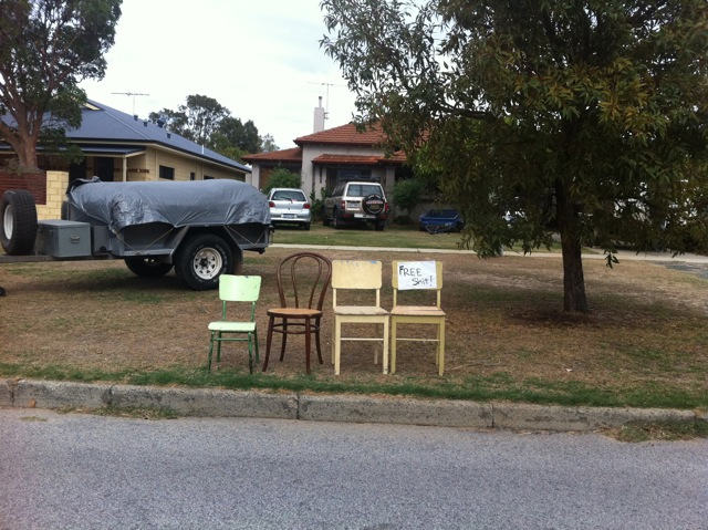 Hmm, early 20th century immigrant nostalgia chairs, huge verge, trees & open sky – I’d say Bassandean through Midland? Not mine although I’d have nabbed those two chairs on the right.