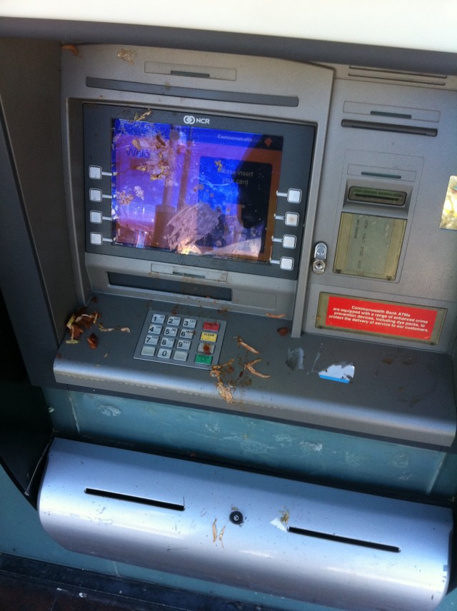 That ATM is alway disgusting on a Sunday morning. God damn wankers from the suburbs coming in to town and fucking up my hood.