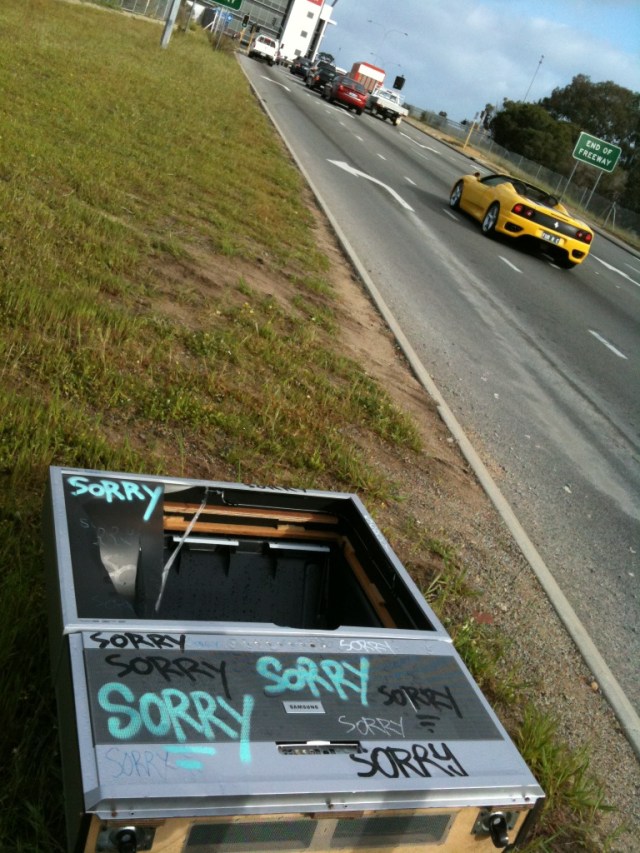 The juxtaposition of the smashed telly with the Ferrari in the background is brilliant. It looks to have a stupid number plate FER R E.