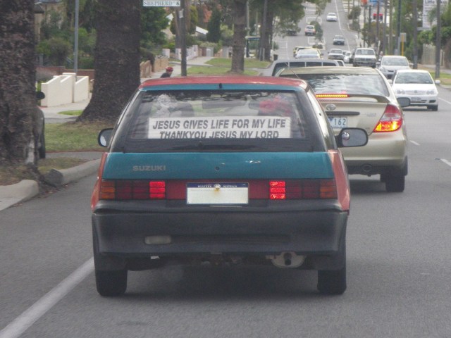 I think they ment Jesus gives us life not Jesus gives my life (Thats still disrespectful and they should be ashamed to have that in there car).
