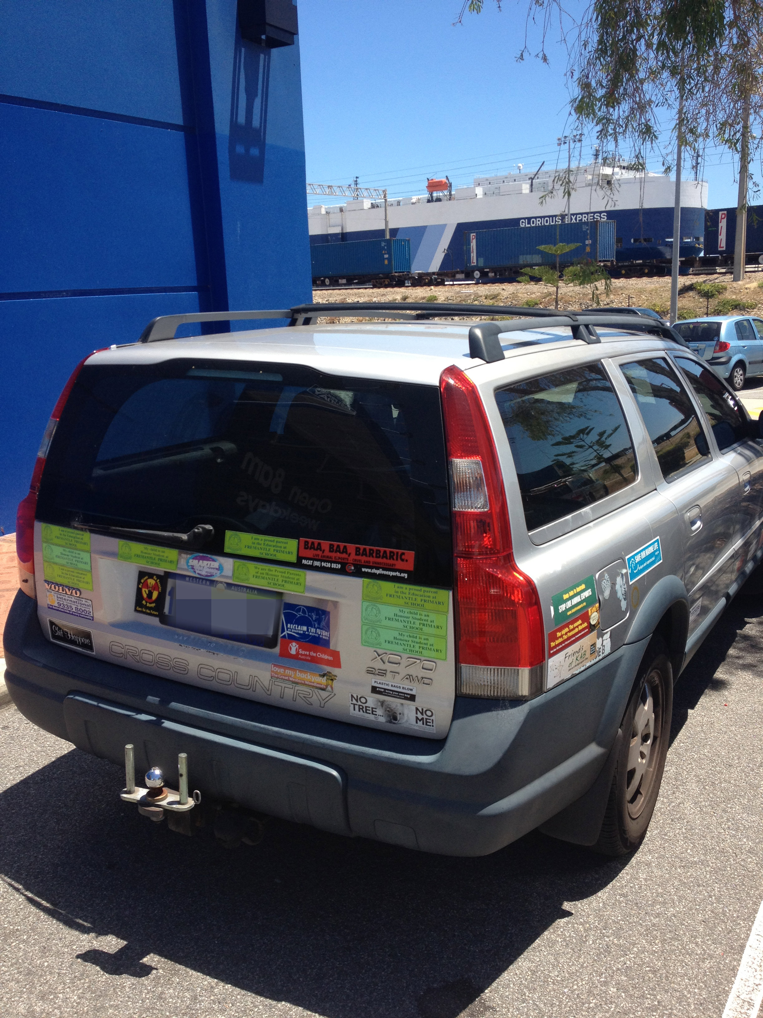 Tristan H submits Flat Cat, with the added bonus of ute with spotlights and Red Rooster rampant. Let me just throw P.’s HONOUR STUDENT!!!! Volvo into the mix. I’ll wager that the honour student insists on being dropped off 5k’s from the school grounds. I have left it clickable for closeup perusal. Both of these seem a little quaint after yesterday’s vehicle, and I couldn’t shake the feeling that I had featured both before. Rivervale and Fremantle.