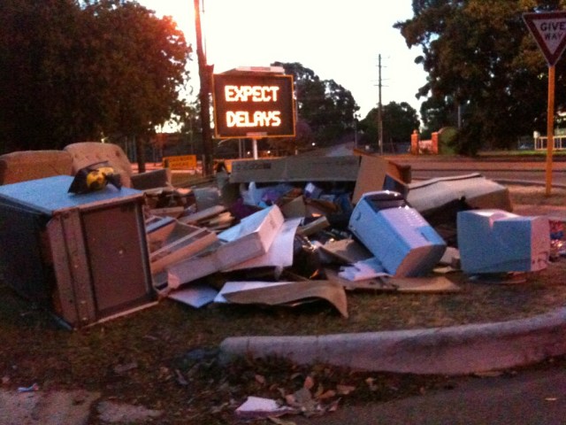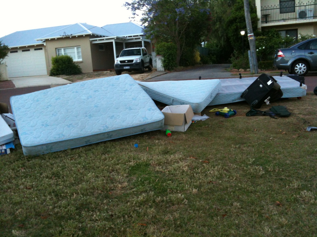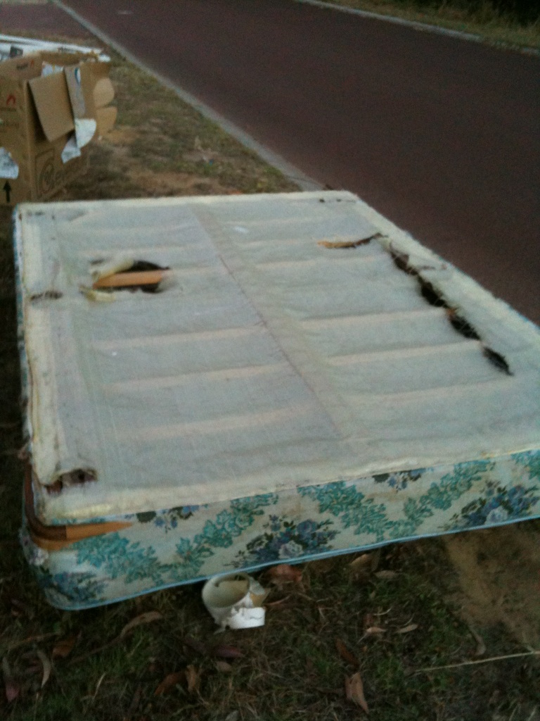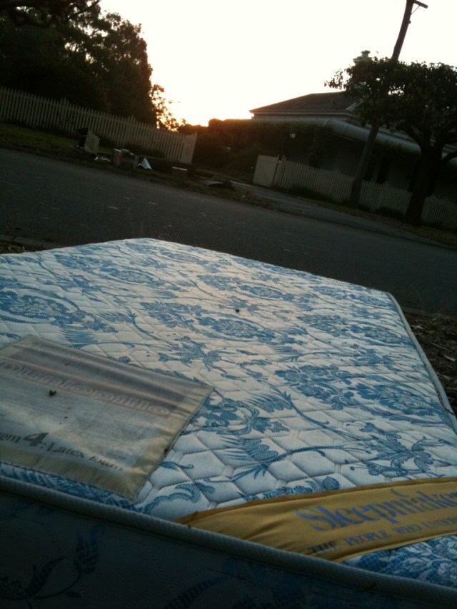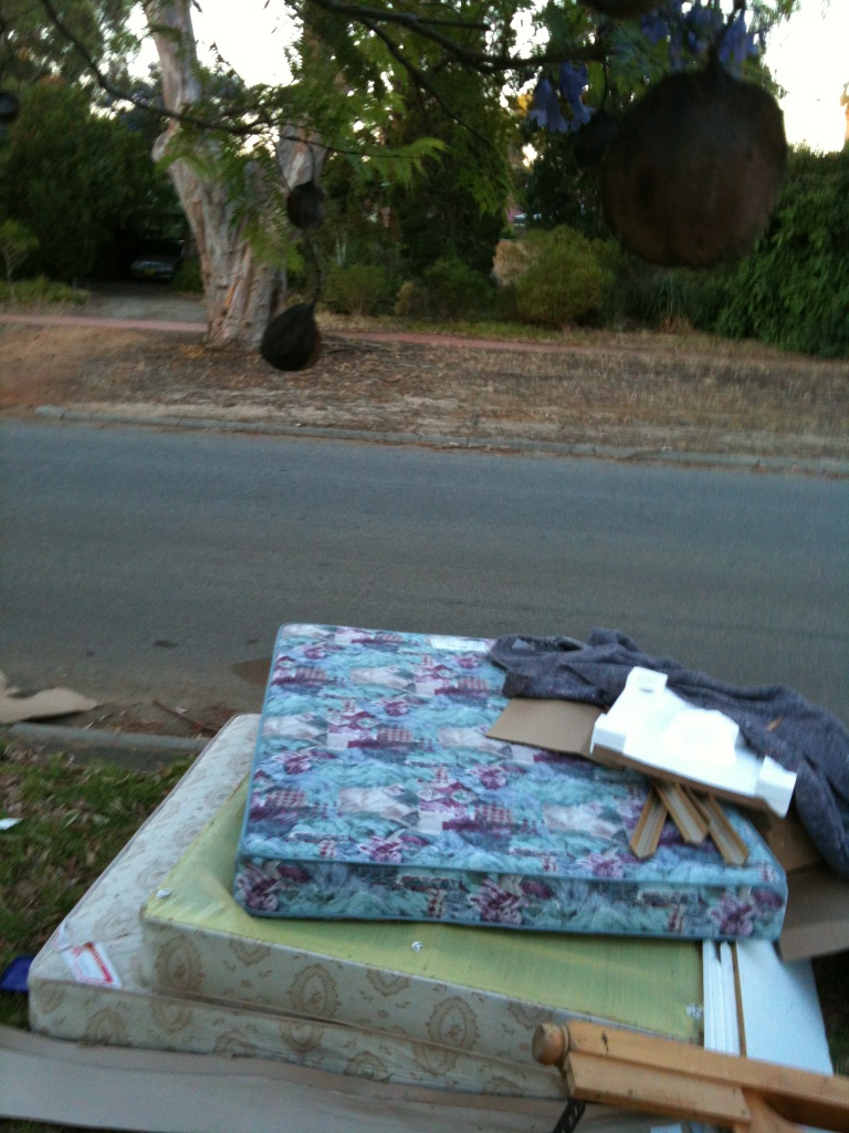 Ferrall pere et fils must laugh like drains when they get the TWOPment. “Yack it up, you balcony-dwelling, quince paste sniffing, neo-Kantian corksoakers ‘cos we are about to crush our toes by dropping our wallets on our feet.” Krazy Kym and I walked the dogs this week and we were knee-deep in urine-stained mattresses (none, alas, endorsed by famous Beaufort Street Teh Arrondisement residents). What goes out must come in. I bet BSwaM doesn’t see this in his part of the US of A. An explanation of these pics for aliens like BSwaM: if you lie on a mattress and sing the WA state song, you get 5 per cent off your next power bill. Of course this was put on hold during CHOGM. We were thrilled to see a Dunlopillo: could it have been the very mattress Robert Drewe’s father presented to him at the end of the uproar and confusion in The Shark Net?* Our literary and heritage overlords should’ve taken it away for preservation. I ordered the dogs to pull the King Koil queen from under the sensational pile so I could better photograph it, but they cocked their legs. More urine.