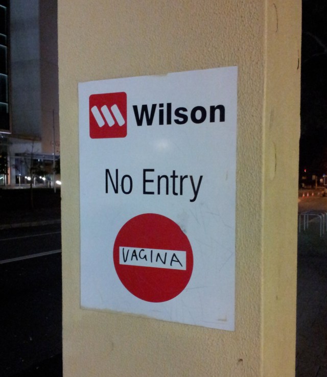 It doesn’t say vagina – the V is in fact an out of whack L … it really says La Gina … the “no entry” comment is a warning to her kiddies – and others – that they will indeed have fuck all access to her iron ore royalties bank account