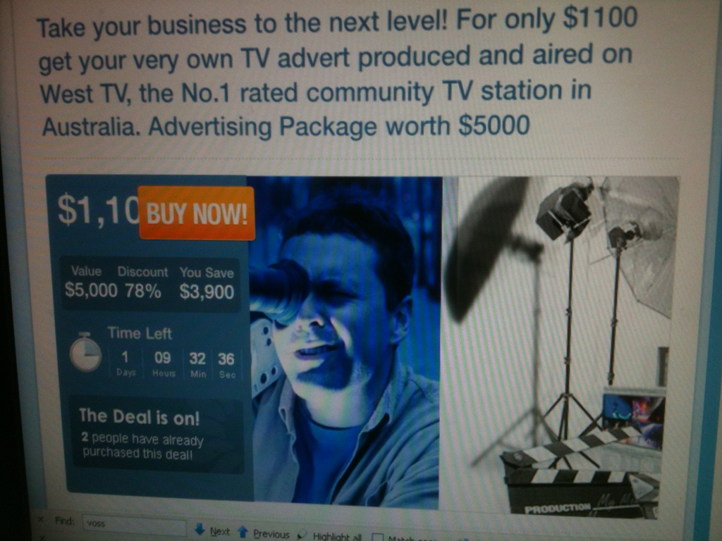 And what a deal! I snapped this up and am now the proud owner of 112 ads (15 sec each) on West TV! They’re throwing in “photo stills and key messaging”! My ad will be on four times a day for four weeks! It will be seen by “over 80,000 community viewers” every day from “Lancelin down to Mandurah and the Perth Metro”! I now “have the chance to be seen by the people who are important to your business!”