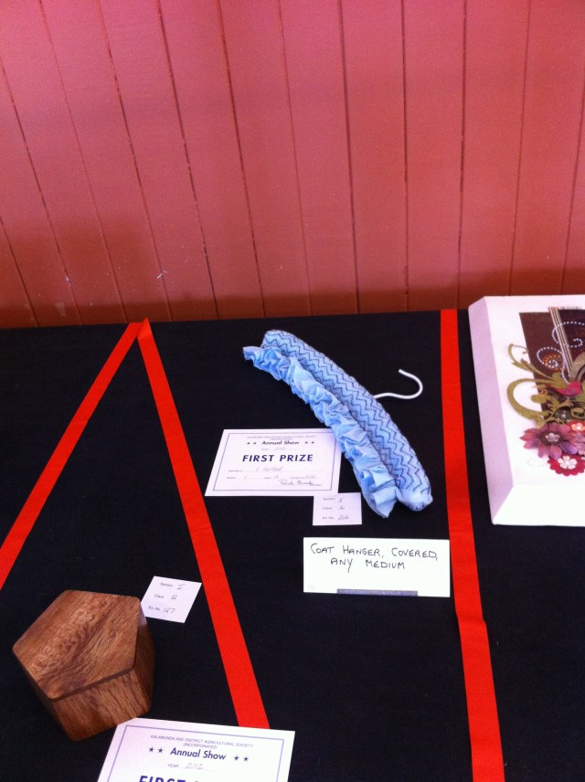 The Kalamunda Agricultural Hall was mentioned the other day as the place where Alby Mangels showed his World Safari movies. The place is still culturally breaking bad as Bento saw when he went to judge the coat hanger covering – any medium section. This one was quite refreshing, as the Hills avant garde artists usually favour faeces, asbestos, dog heads and human skin for their art.