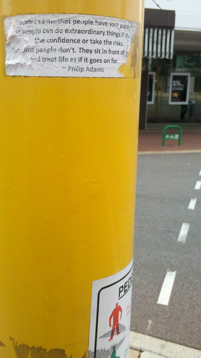 JJ writes: I was minding my own business down in Peppermint Grove yesterday afternoon, when suddenly I found myself awash with eerie sensations. My Worst sense was tingling! Sure enough, someone had seen fit to copy and print out on sticker paper this self-serving bit of optimistic fluff for rich people. Note the invitation to heedlessly take the plunge, cunningly situated at the pedestrian crossing. We all have it in us but sometimes it’s nice to see it strewn about the pavement for a change.