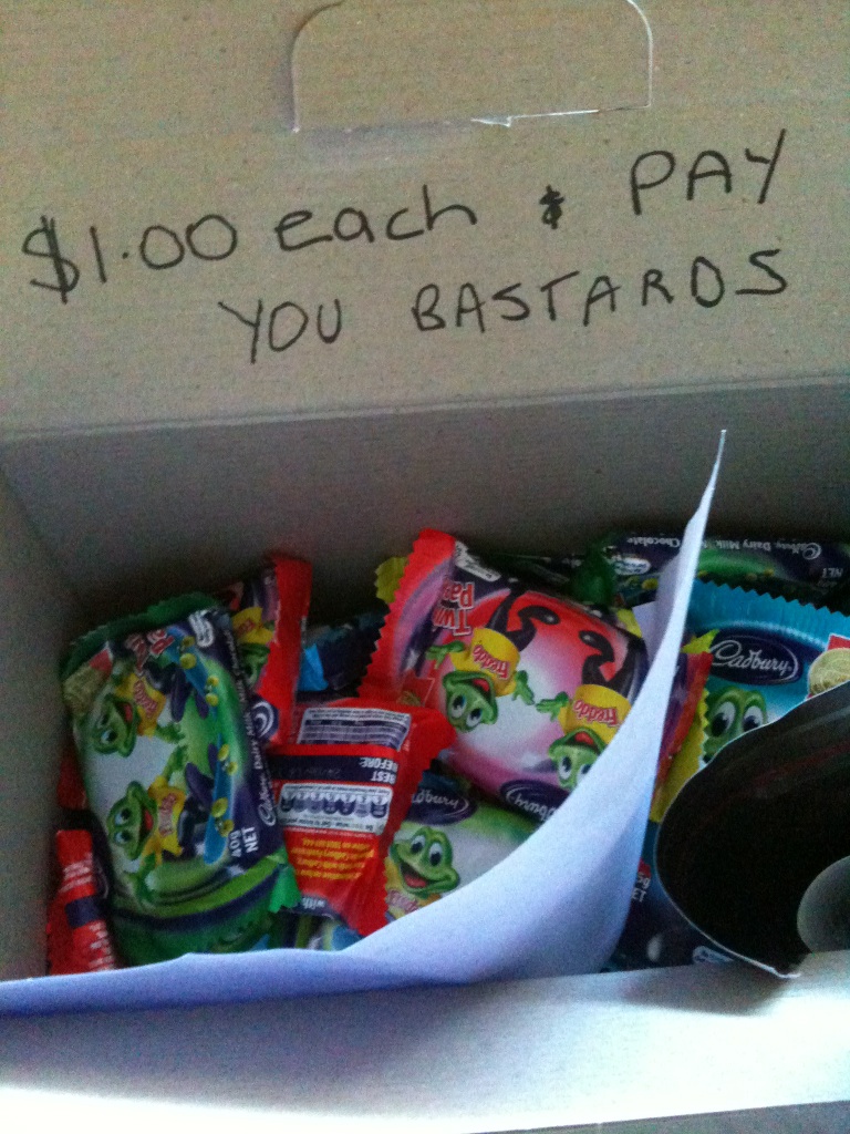 Telling people to pay for freddos, LOL when the kids in my neighbourhood do funraising everyone just takes them from the box as soon as they open the door.