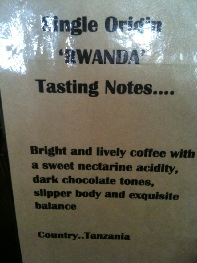 Krazy Kym and I had a half double decaffeinated half-caf, with a twist of lemon, in the Swan Valley, but were baffled by the tasting notes. How can something called Rwanda come from Tanzania? It doesn’t make sence!