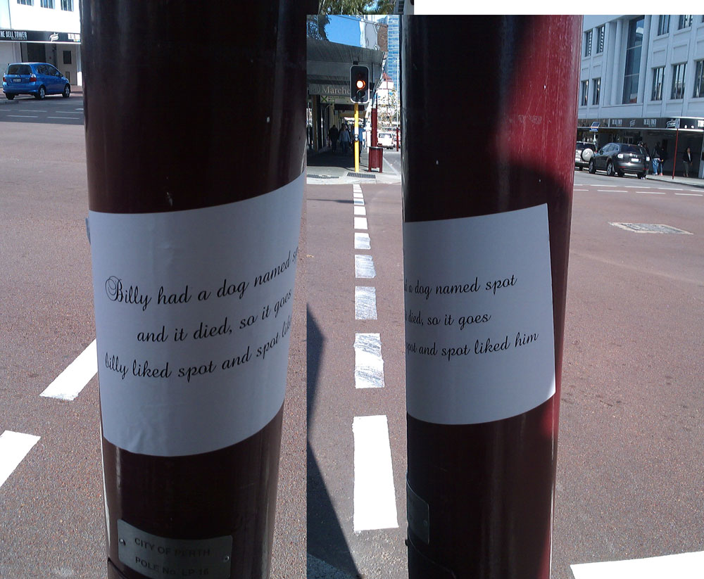 northbridge poetry bombing: 2 copies of the same poem laminated to a pole