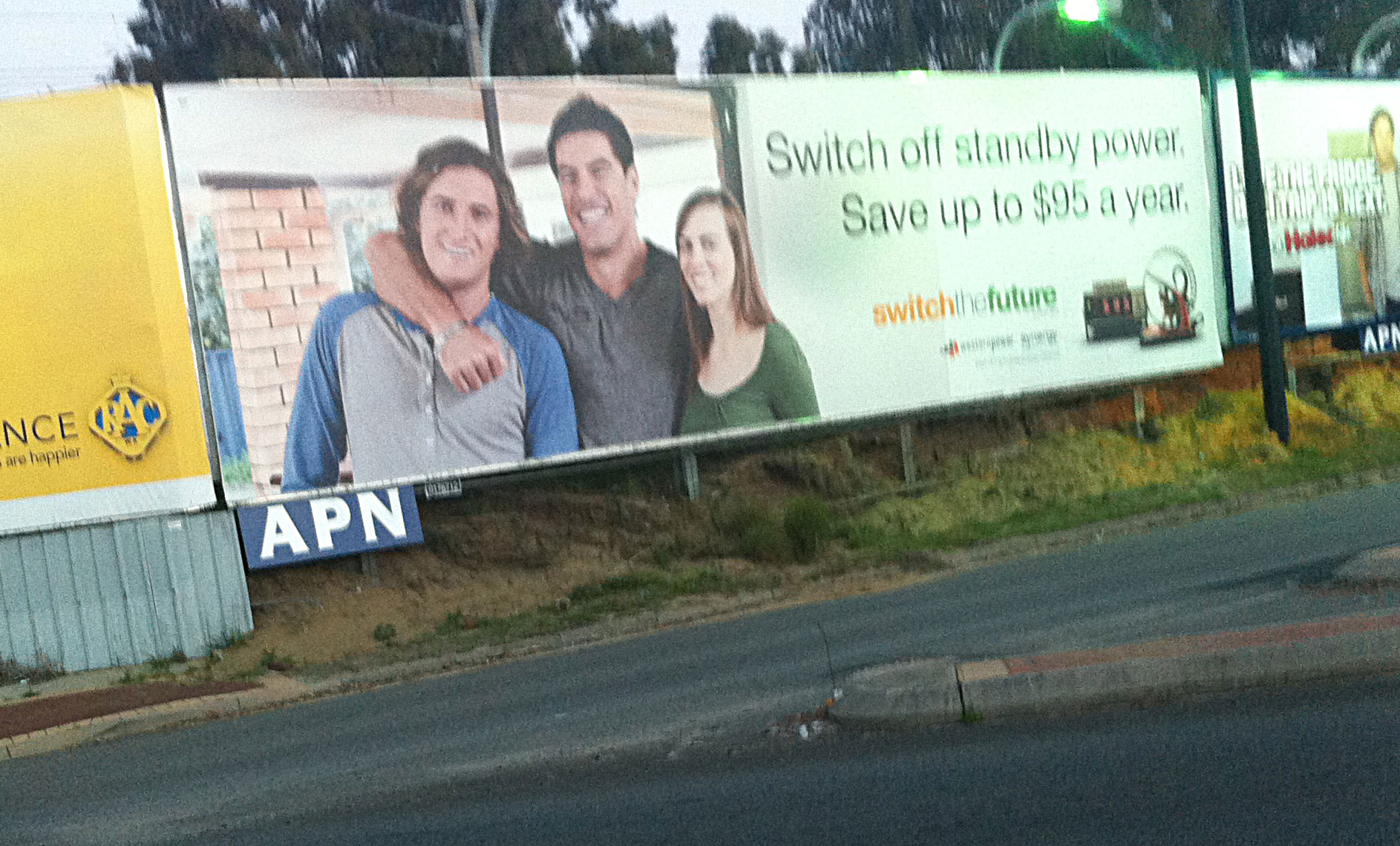 I drive past this often; it’s been annoying the fuck out of me for months. The slogan is ungrammatical. Unless part of an imperative to somehow beat the future with a switch (a just fate for the threesome, or for that stupid fucking hamster), switch is transitive (i.e. one switches on or to) so that “switch the future” makes no sence whatsoever. What’s more, the presumed play on light- or power-switch is simply insufferable. I could go on, but allow me to say that the worst crime here is the utter incoherence produced by ramming together several ideas (thriftyness, environmentalism, cute animals, anachronistic technology, mateship, etc.) where one or two would have sufficed. I hope whoever designed this abominable piece of advertising reads this, in which case I say: you, sir/madam, are a cunt. Switch the future cunts? Where’s my fiddy thou’, WP?