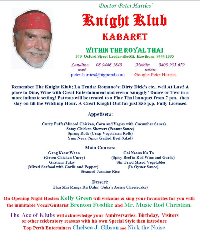 “Dr. Peter Harries is opening a Kabaret Restaurant in Perth on November 23 in time for the Christmas party festive season. Remember his Knight Klub, La Tenda, Romano’s, Dirty Dick’s theatre restaurants? Well, at last a place to dine with great entertainment and, even, a snugly dance or two? All for, just $55 per person, fully licensed.
