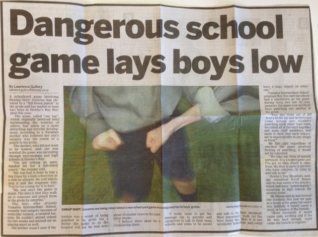 Does this explain the success of the All Blacks? Or perhaps the accent? Surely even New Zealand schoolboys have better things to do than flick each other’s testicles – for fun. Maybe they never properly read the rules for conkers. Or marbles? Or yo-yos? The article could have done with Outrage’s writing style though. There’s no “black and blue balls” for a start. Sent by Nate. Another TWOPer travelling the world. From Hawke’s Bay Today.