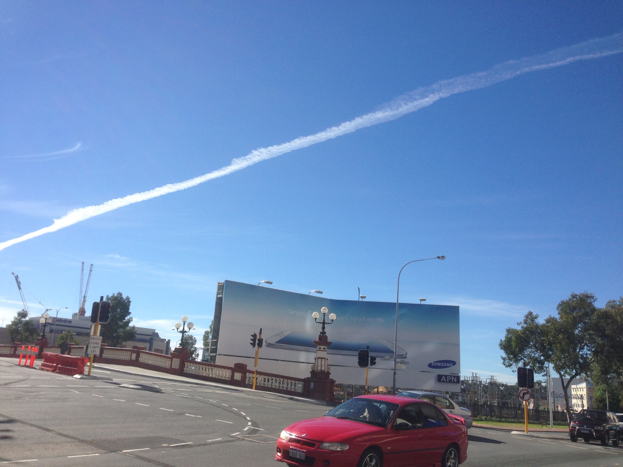 Rush outside! See the evidence of a chemical or biological agent about to gently rain on us all. It is a sign of out troubled times. You can be sure there will be no mention of chemtrail funding in today’s Federal Budget, so it must be true. Stay safe out there.