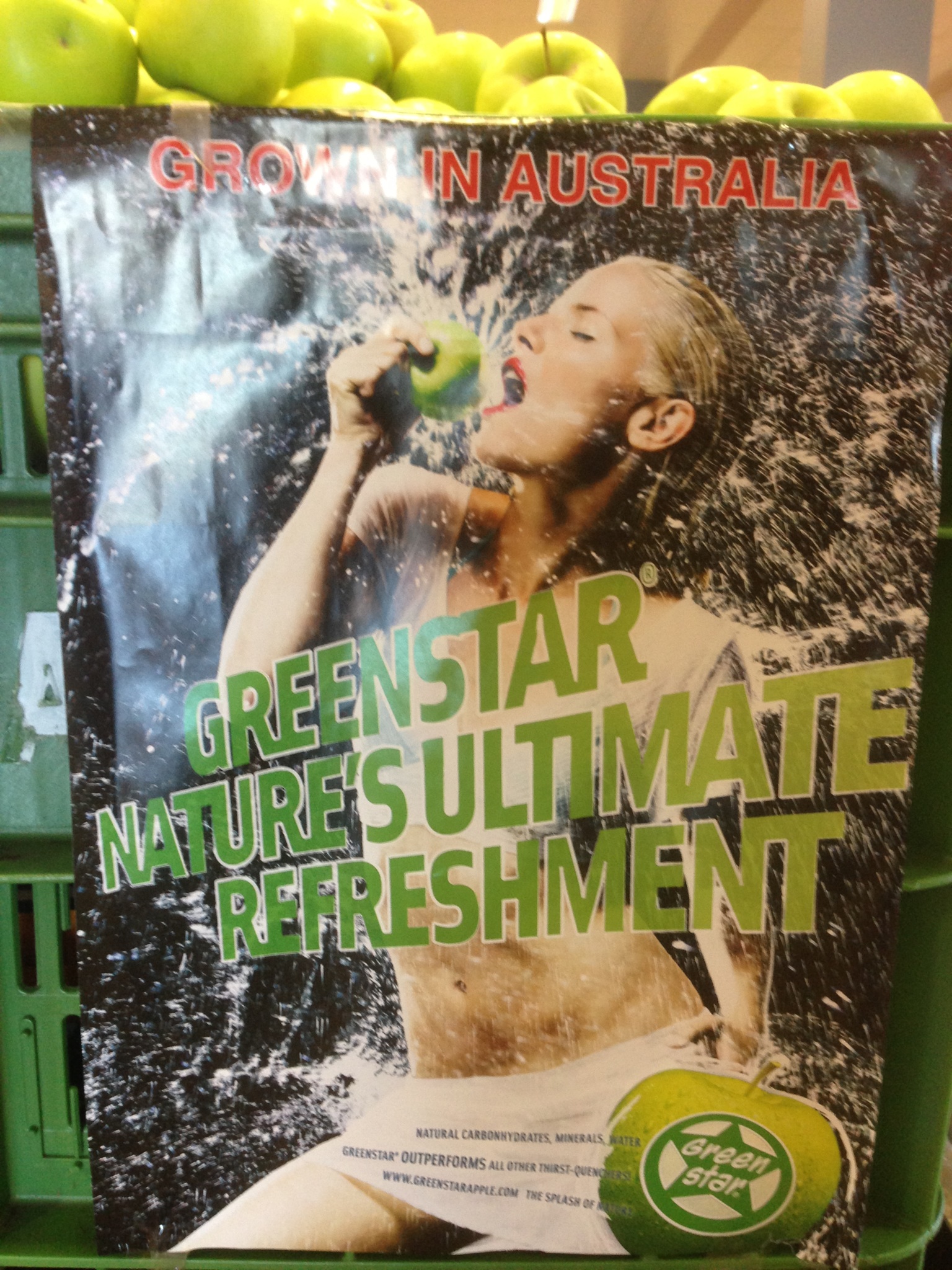 Far be it from me to unsmudge TLA’s energies, but I fear he will be enrages by this triptych. Krazy Kym dutifully bit into her apple expecting the poster scene to be replicated – but she was not drenched in juice. What the? Cue a predictable Flangemaster diatribe about the worstness of our apples. I will have a lie down on my “doona”.