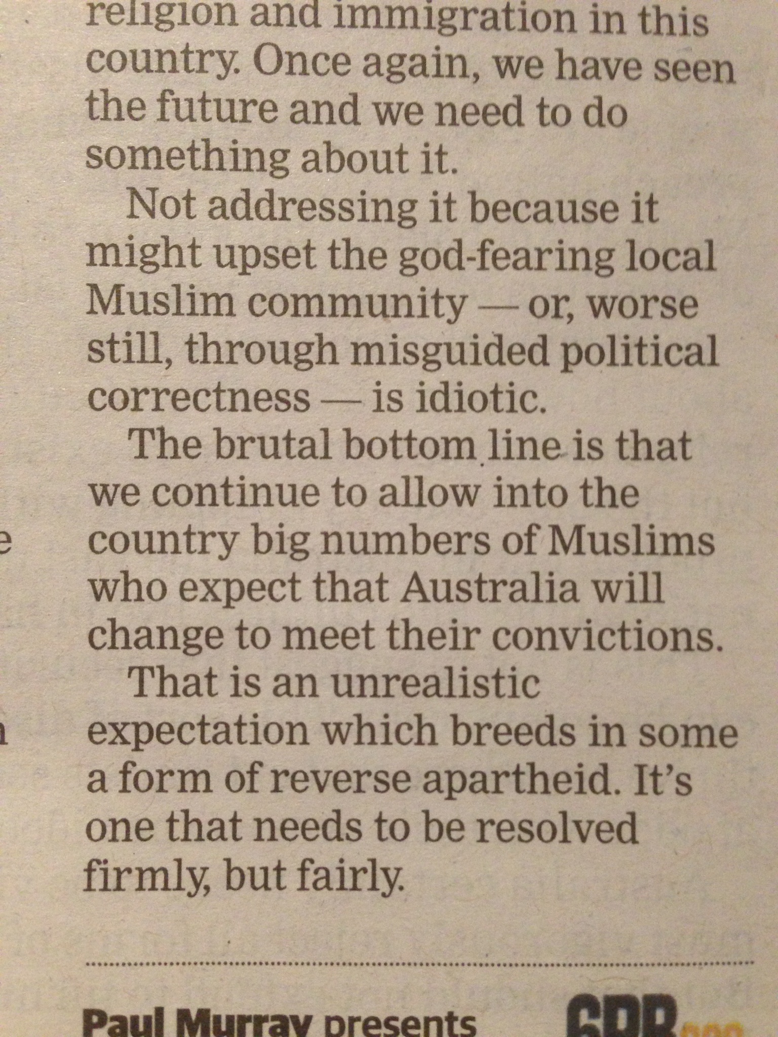 Speaking of bores, did you see Mr Murray in the paper of record yesterday? More cutting and pasting. “Big numbers of Muslims”! How big? Mr Murray didn’t say. Those clowns at the ABS claim: “At 30 June 2011, 27% of the estimated resident population was born overseas (6.0 million people).” And: “Persons born in the United Kingdom continued to be the largest group of overseas-born residents, accounting for 5.3% of Australia’s total population at 30 June 2011. This was followed by persons born in New Zealand (2.5%), China (1.8%), India (1.5%) and Vietnam and Italy (0.9% each).” We’re being overwhelmed by Muslims! Danger!