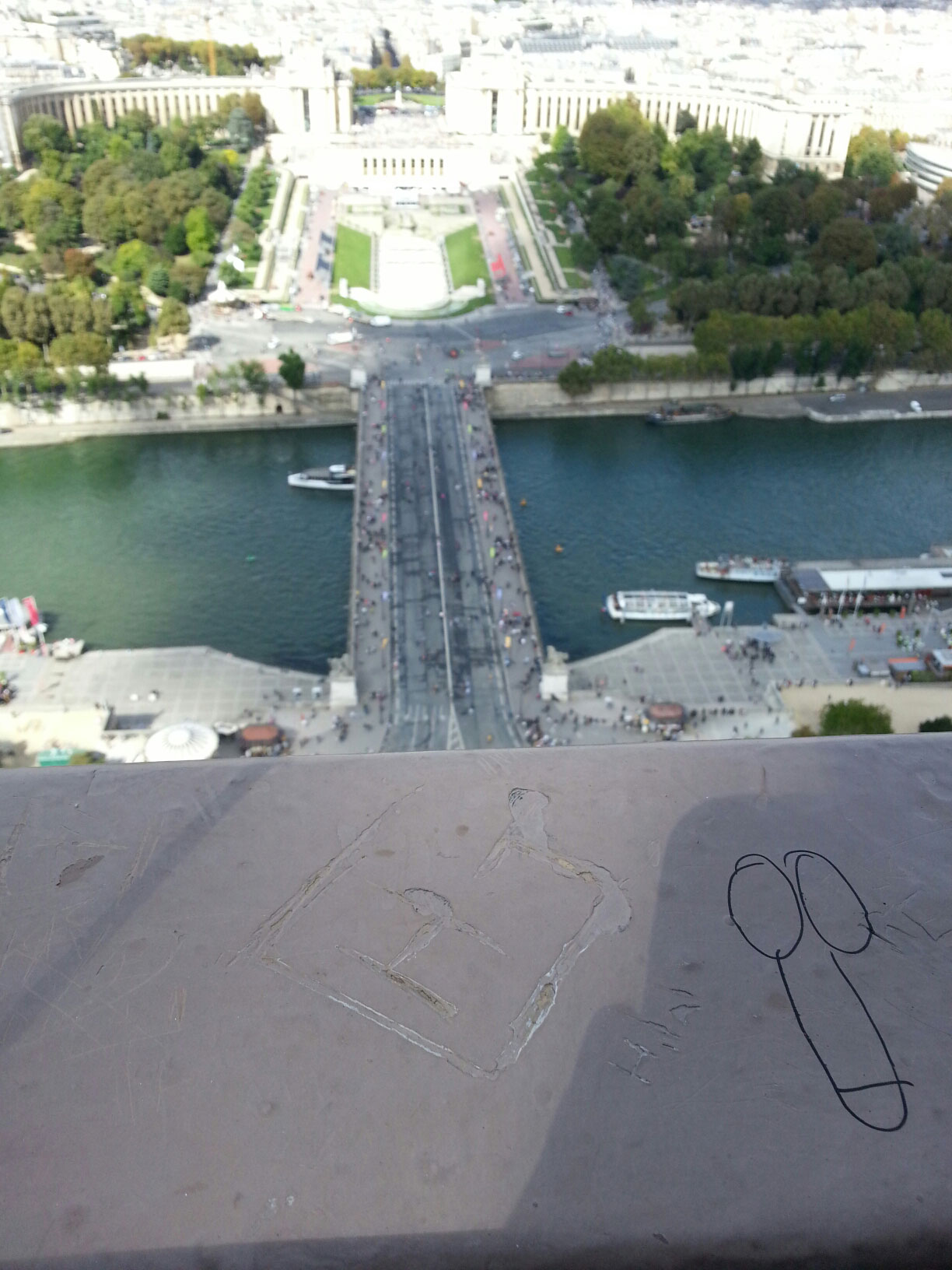 This site of record seems to be documenting a steady decline in cock and balls graffiti around the world (apart from here), a little like the drop in muggings in New York City. Perhaps they are connected? Maybe there’s a dicking point to go with the Tipping Point? Anyhow, Jonny saw a rare example on the Eiffel Willie itself. It may be the last.