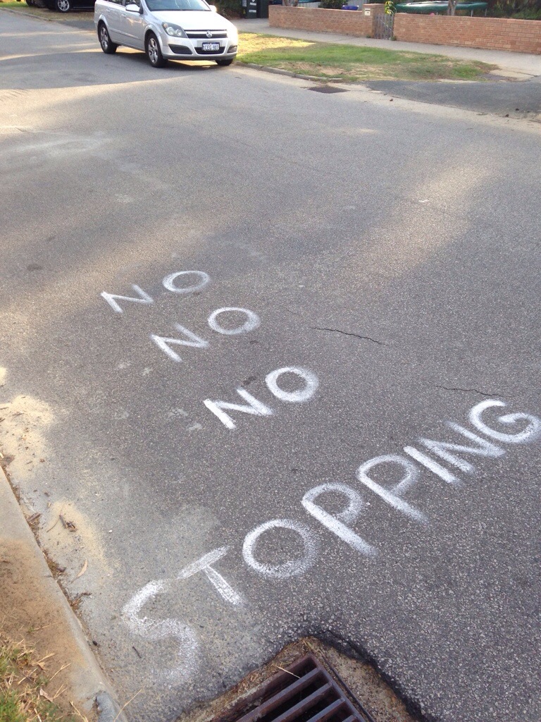 Daniel B notes an attempt to actually register a road. It doesn’t count if you try to spray paint your own road rules. You might as well write “No Sigmas”. Mt Hawthorn.