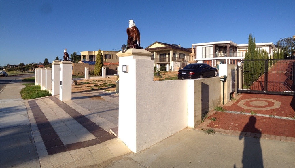 No way! I took photos of that house too! But they were so bad that I didn’t send them in. It is a truely magnificent example of poor taste, that house. Last time I went down that road every second house (it seemed) was for sale. I wonder if it’s because the eagles are bringing down the tone of the area? The only things missing from that place are the registered lawn sign, cocos palms and a box tree to drop it’s nuts on the path. Then it would be perfect.