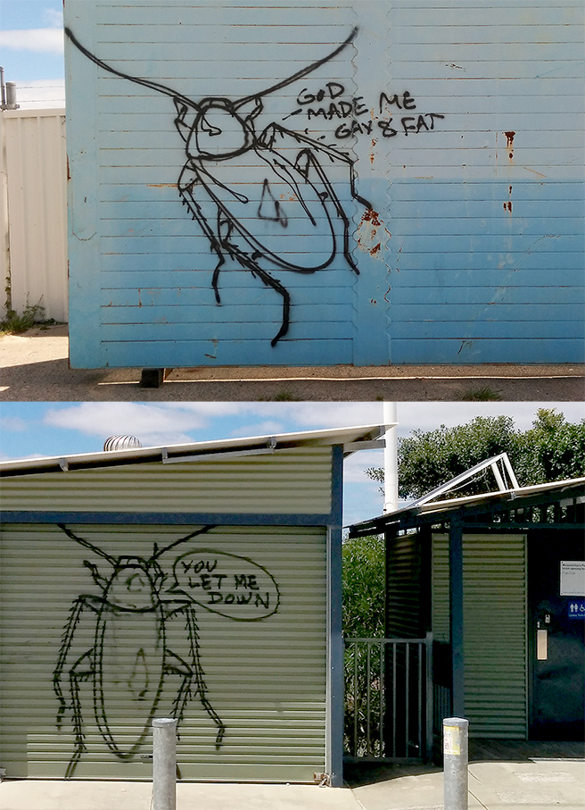 Some arts, possibly but probably not vandalised. Nah I guess the text is deliberate, otherwise, where’s the C&B on the cockroaches? Booyeembara Park, Fremantle. By Illusiver.