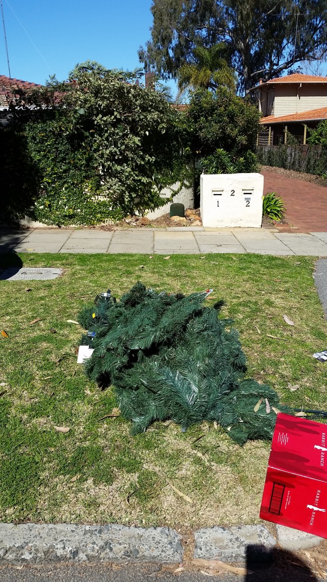 Let’s start by assuming the Rabbit Ranch case was their 2012 Pinot Noir. In which case, the household evidently has good taste. So the discarded tree is evidently an artistic statement about the futility of capitalism have supplanted honest religion. Either way, I now want a glass of Rabbit Ranch 2012.
