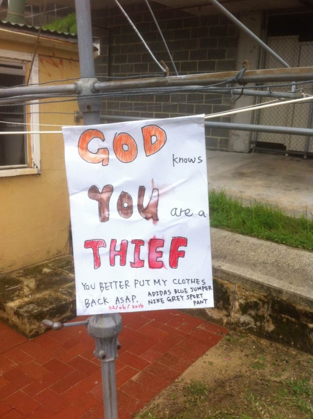 Cynthia C. Tells us that her CBD (not C&B) apartment complex’s Hills Hoist is a crime nexus. Crimes of fashion, crimes of theft, and worst of all, crimes of graphic design and kerning.