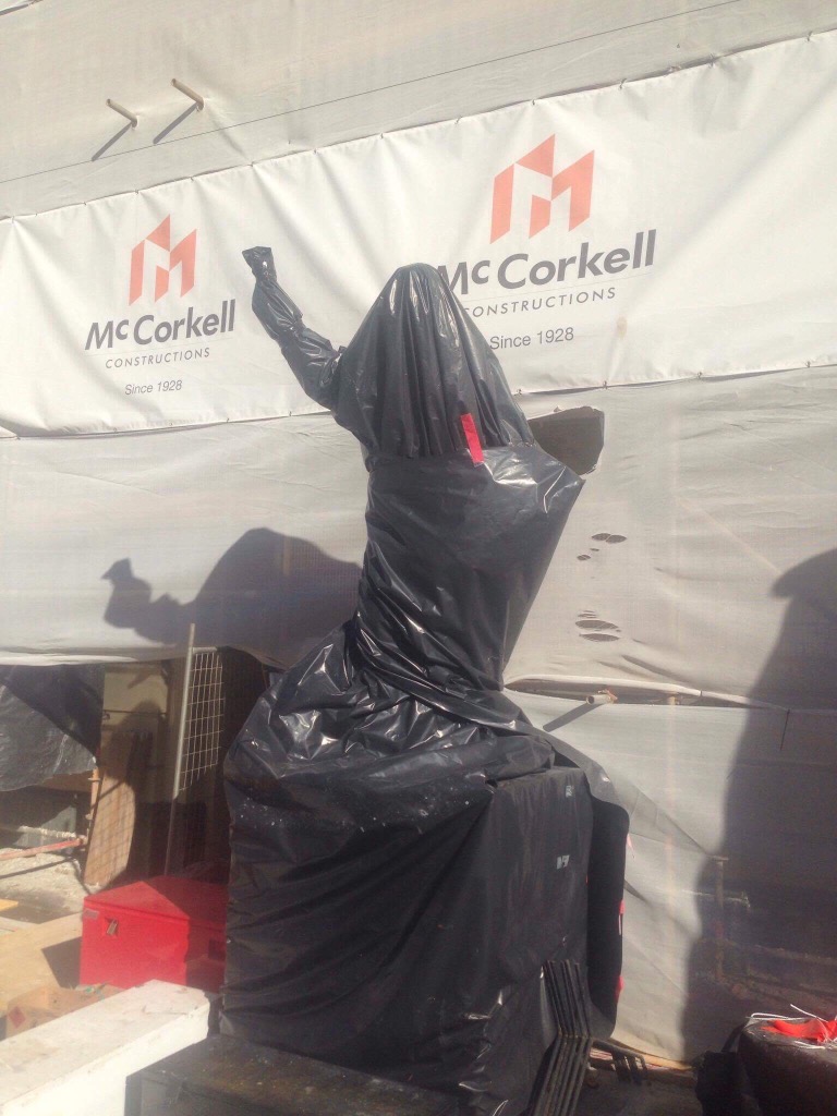 The appallingly awful insult to John Curtin statue has finally been transformed, possibly by Christo himself into something a little more interesting. One of Perth’s most inept bronzes, kind of looks OK wrapped. Thanks to SW for the pic. It was suggested that the statue has short arms because it was supposed to be viewed from a different angle. But if it was proportioned correctly, surely it would look right from every angle? It’s a piece of shit. Please keep it wrapped Fremantle.